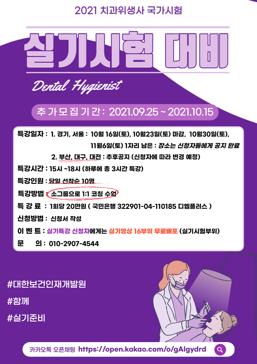 | [국시아카데미] 2021년도 치과위생사 국가고시 실기 시험 대비 (온라인 영상) 안내 (0) | 2021.10.22 |